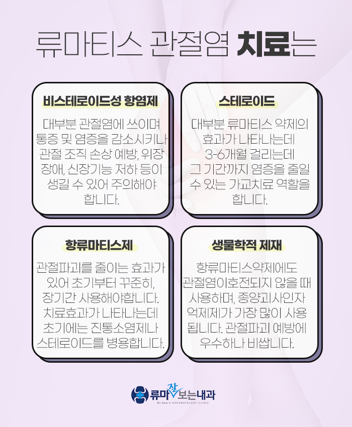 또 항류마티스제는 관절 파괴를 줄이는 효과가 있는데요. 치료 초기부터 꾸준히 사용해야 하며 장기간 사용하도록 해야 합니다. 치료 효과가 나타나기까지 1개월에서 6개월 정도가 걸리는데요. 초기에는 진통 소염제나 스테로이드를 병용해야 한답니다.