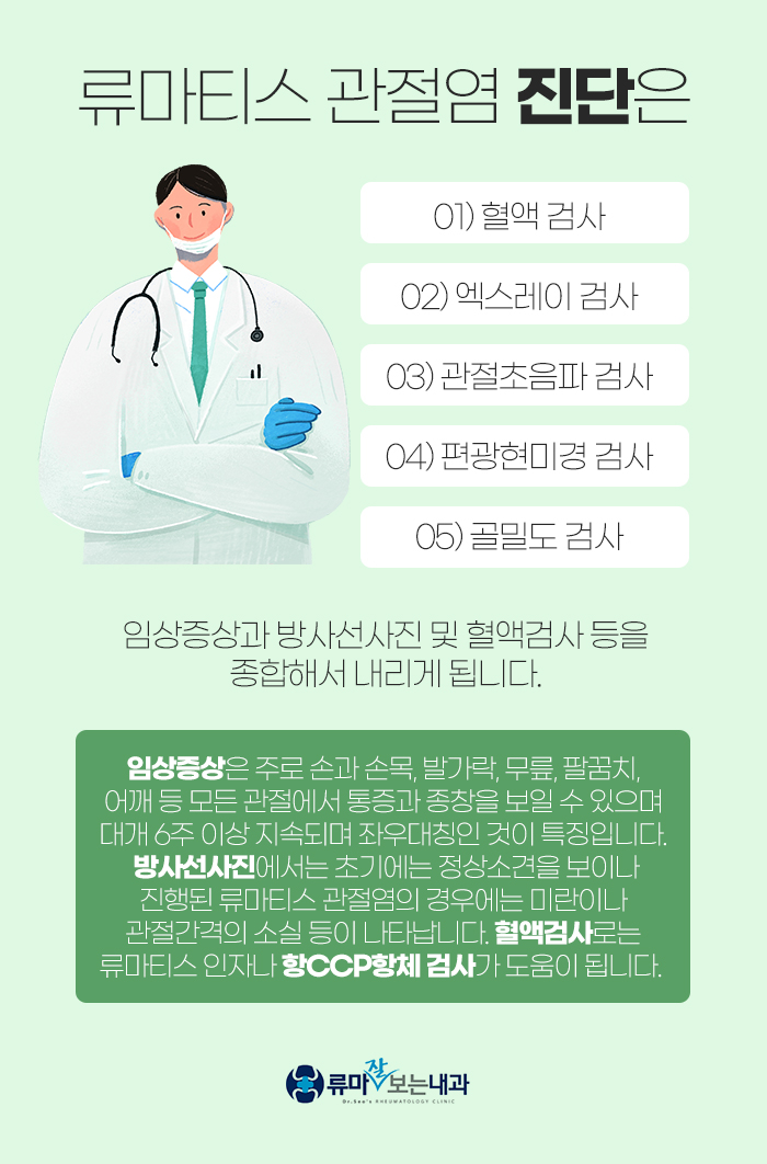 방사선 사진은 초기에 정상 소견을 보이나 진행될수록 미란이나 관절 간격 소실 등이 나타나게 되는데요. 또 혈액 검사는 류마티스 인자나 항CCP 항체 검사가 도움이 된답니다.