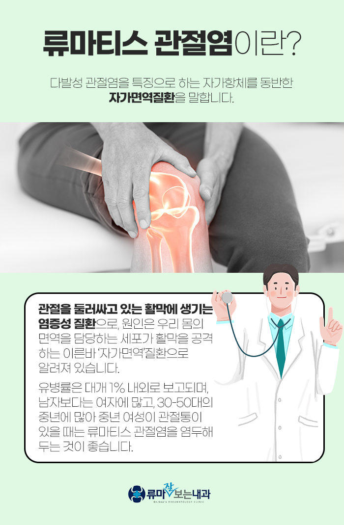 그리고 류마티스 관절염을 앓고 있는 분들이 많은 만큼 류마티스 관절염에 대해 설명해 보자면 자가항체를 동반한 자가면역 질환으로, 다발성 관절염으로 나타나게 된답니다. 관절을 둘러싸고 있는 활막에 염증이 생기게 되는데요. 이렇게 염증이 생기게 되는 이유는 우리 몸에서 면역을 담당하고 있는 세포가 활막을 공격하기 때문이랍니다.