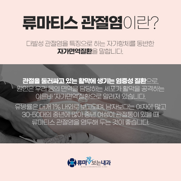 류마티스 관절염에 대해 보다 자세히 알아보자면 다발성 관절염입니다. 자가항체를 동반한 자가면역질환으로, 관절을 둘러싸고 있는 활막에 염증이 생기게 되는데요. 이는 우리 몸에서 면역을 담당하고 있는 세포가 활막을 공격하기 때문이랍니다.