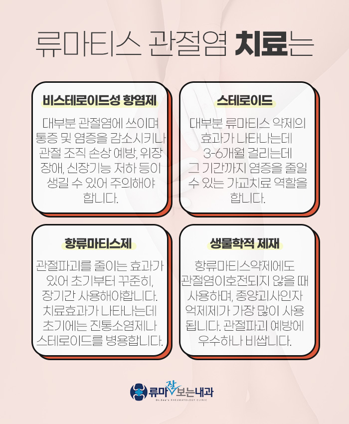 비스테로이드성 항염제는 대부분 관절염에 사용되는 약제인데 통증을 감소시키면서 염증을 줄이는데 도움을 줍니다. 하지만 관절 조직이 손상되는 것을 예방할 수 없습니다. 또 스테로이드는 대부분 류마티스제가 효과가 나타나는데 3개월에서 6개월 정도가 걸리는 만큼 그동안 염증을 줄이는데 도움을 주는 역할을 합니다. 단 장기간 사용하거나 고용량으로 사용하게 되면 합병증을 유발할 수 있기 때문에 가급적이면 소량으로 단기간 사용해야 합니다.