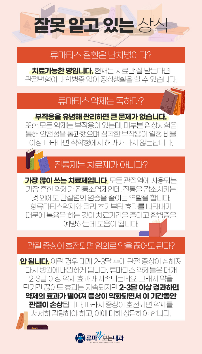 그리고 대구류마티스잘보는곳을 찾으시는 분들을 보면 정말 나을 수 있는지 문의주시는 경우가 많은데요. 이는 과거에 치료가 어려웠기 때문입니다. 그도 그럴 것이 약제도 부족했고 그만큼 관심도 적었는데요. 하지만 이제는 여러 약제들이 개발된 데다 연구도 많이 활발해져서 치료만 잘 받는다면 관절이 변형되거나 합병증이 발생하는 일 없이 정상적으로 생활하실 수 있답니다.